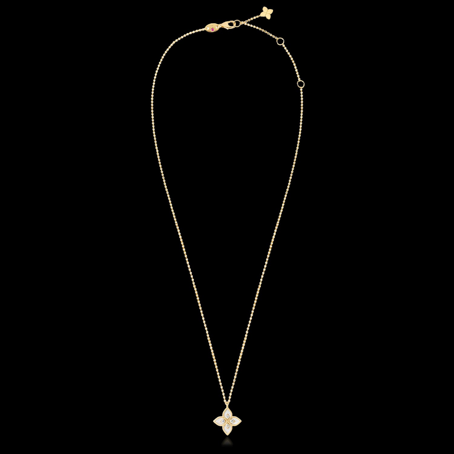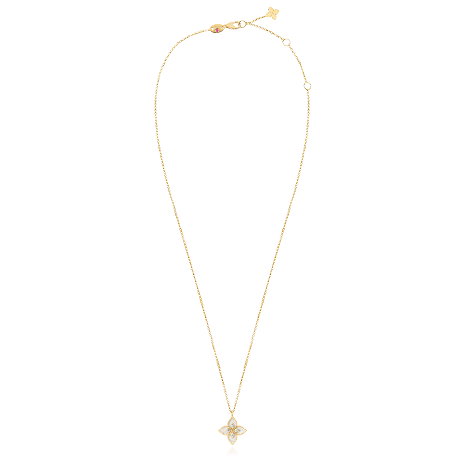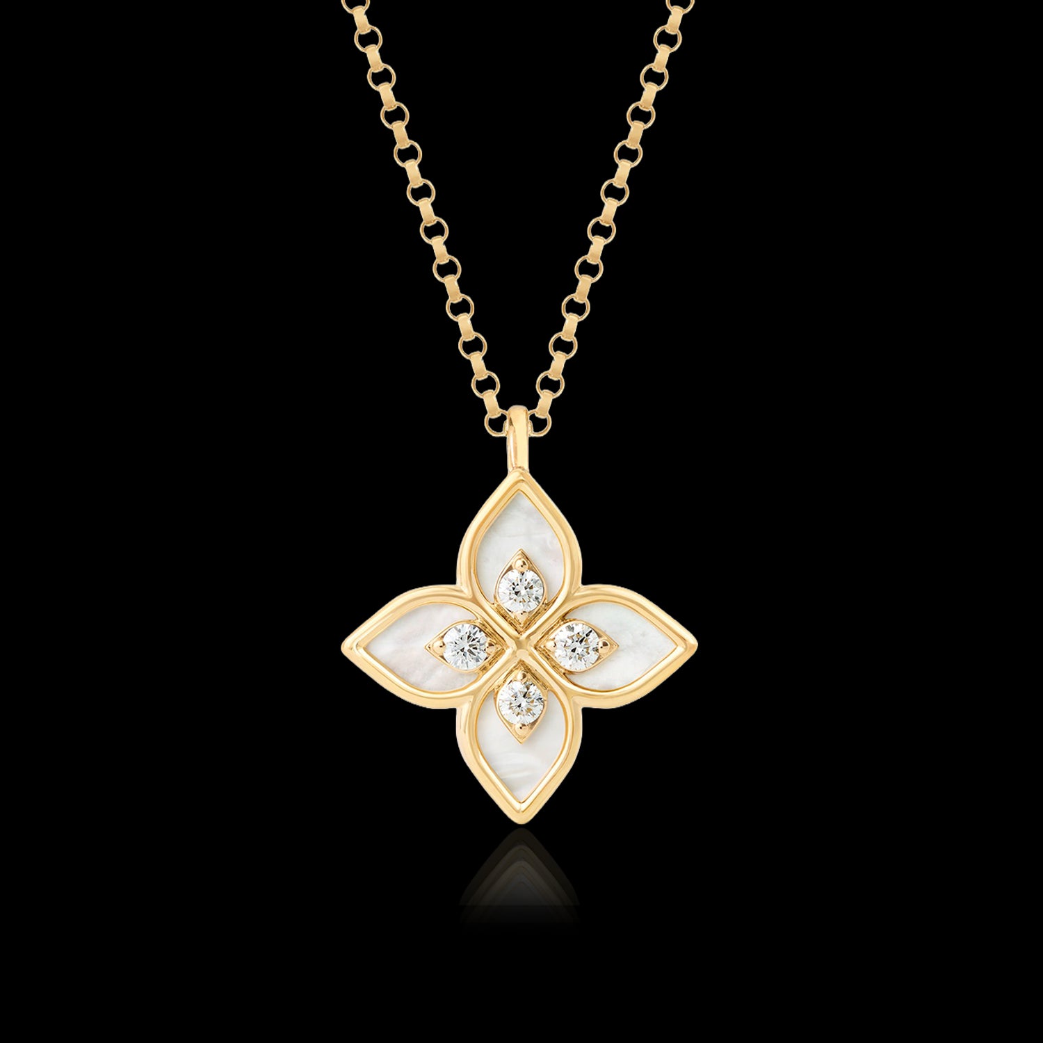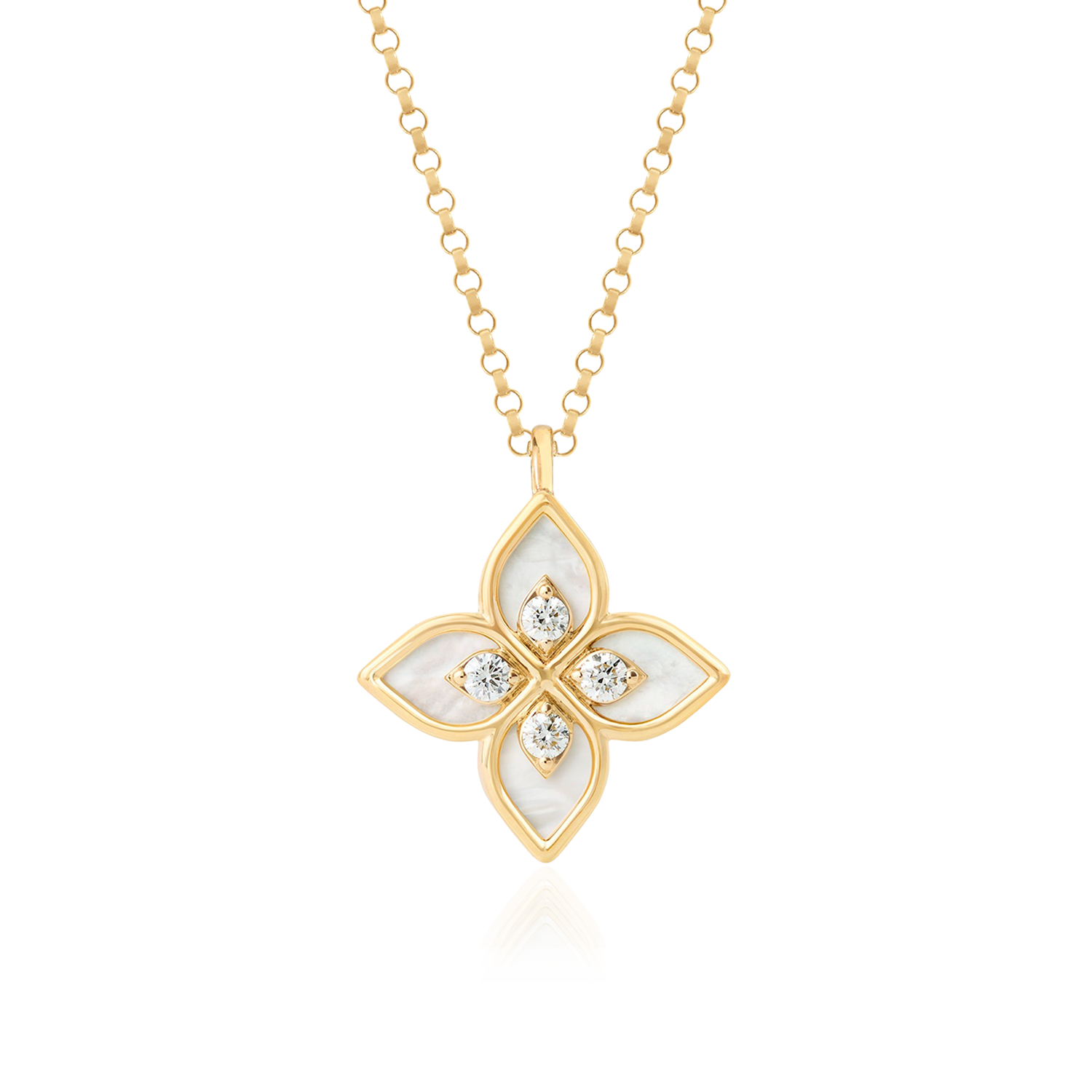Princess Flower for Carousel necklace in 18kt yellow gold with diamonds and mother of pearl. The length of the necklace is adjustable from 400mm to 450mm.
