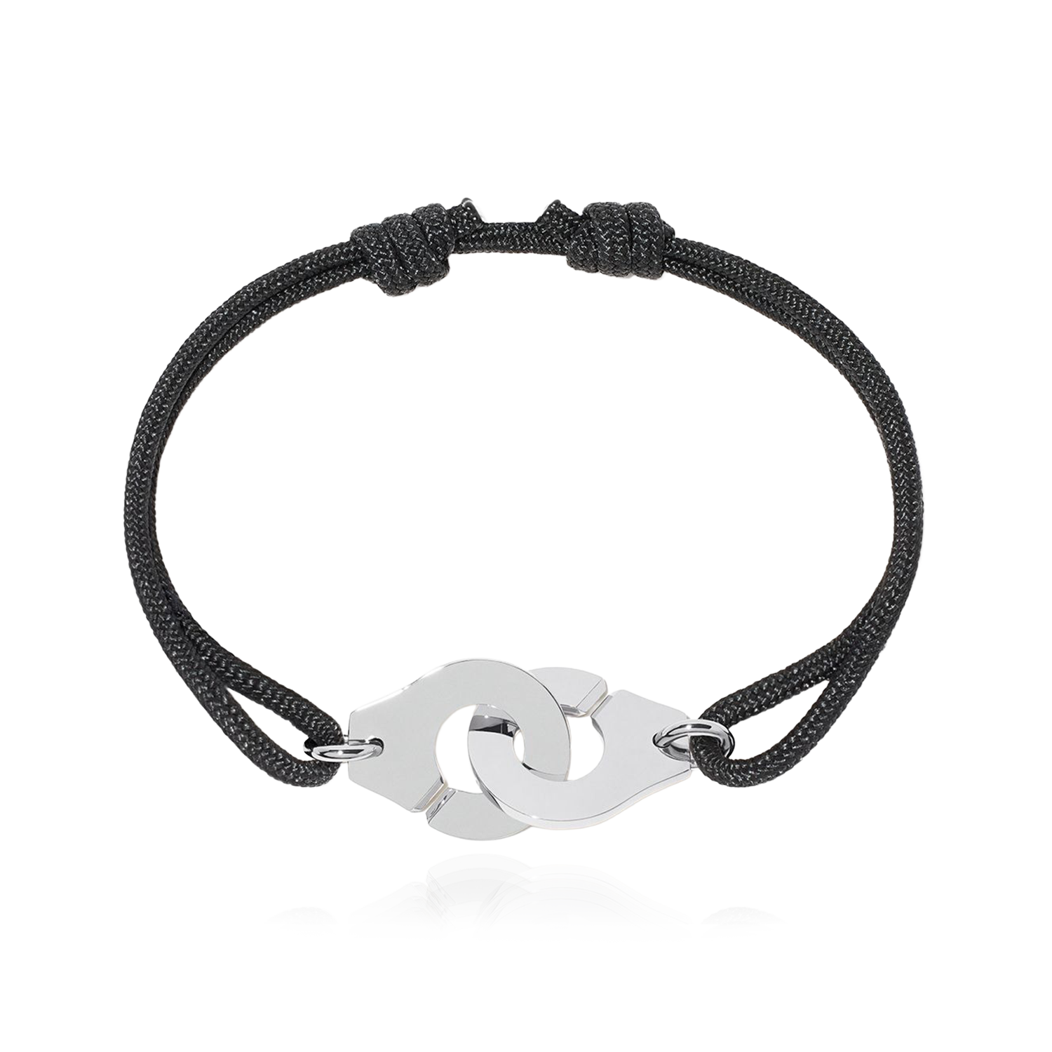 With its cord, the Menottes dinh van takes on a new expression: a soft, free-form link with a firm attachment. This platinum version of the large cord bracelet model affirms its deep symbolism, synonymous with strength and longevity.