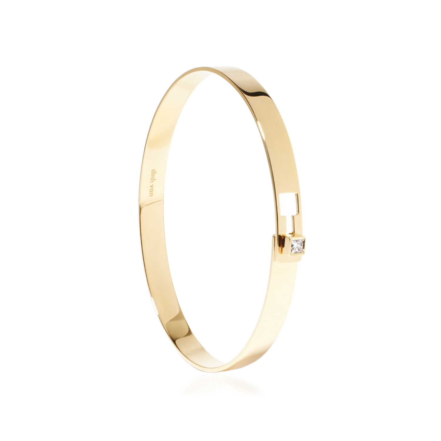 Adorned with a princess cut diamond, this architectural detail catches the light, becoming a distinctive feature in its own right. Designed to be a treasured sculpture worn in day-to-day life, this yellow gold diamond bangle demonstrates the beauty created when sobriety and character are perfectly balanced, giving you the avant-garde spirit of dinh van at your fingertips.