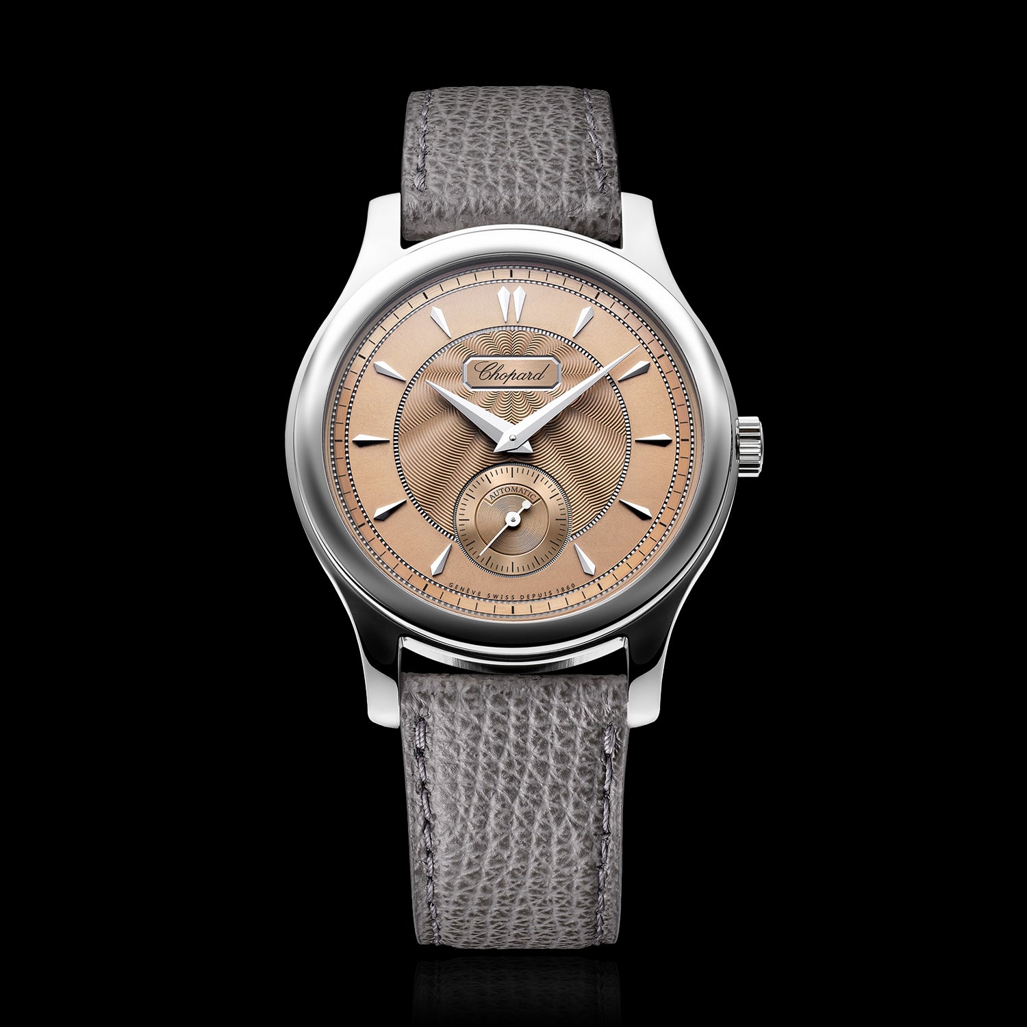 Faithful to the original proportions and design, this L.U.C 1860 Swiss watch is crafted in Lucent Steel™. It is embellished with a gold-base salmon-coloured hand-guilloché dial and a vintage calf leather strap. Testifying to the horological expertise of Chopard Manufacture, this chronometer-certified luxury watch bearing the Poinçon de Genève quality hallmark is equipped with L.U.C Caliber 96.40-L. Despite being just 3.3 mm thin, this movement is nonetheless equipped with a gold bidirectional micro-rotor and two barrels enabling it to guarantee a 65-hour power reserve. The L.U.C 1860 luxury watch represents a highly reliable horological feat endowed with a timeless design and destined for the most discerning collectors.