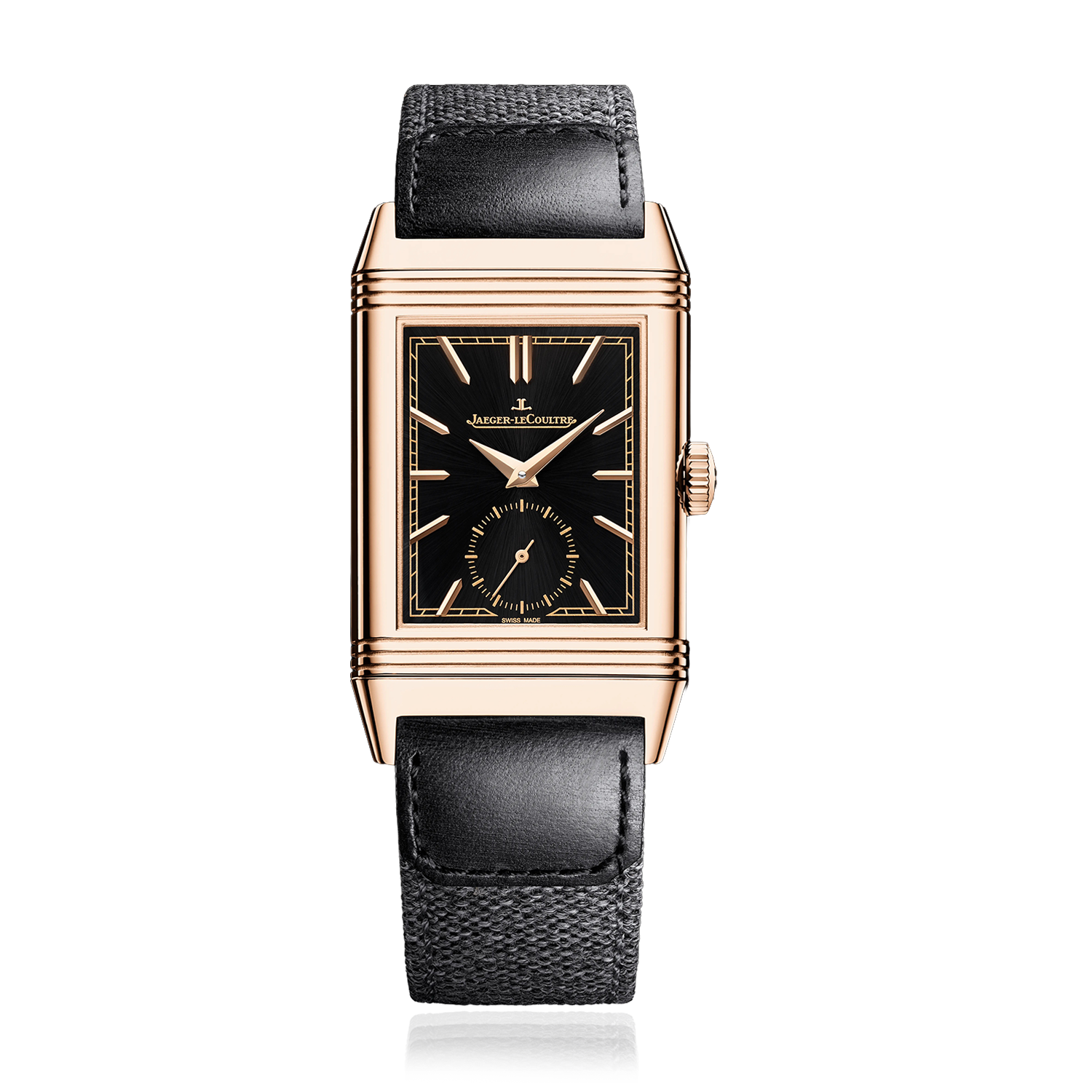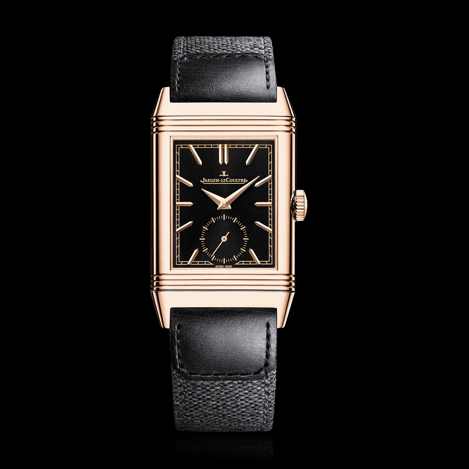 In line with the colored dials that were emblematic of the Reverso collection in its early days, the Reverso Tribute Small Seconds lets black play the leading role. A tribute to the avant-garde spirit of our Maison which, in the 1930s, was one of the only Manufactures to offer coloured dials at a time when white and silver dials were still the norm. On the black sunray dial, which changes under the play of light, every detail takes on relief and depth. This pink gold version with its ultra-thin case (7.56 mm) and customisable reverse comes with two interchangeable straps. A nod to the polo field atmosphere that embodies the Reverso spirit, the leather strap and the bi-material strap (leather/canvas) in the Casa Fagliano design invite the wearer to move from a casual to a more dressed-up style.