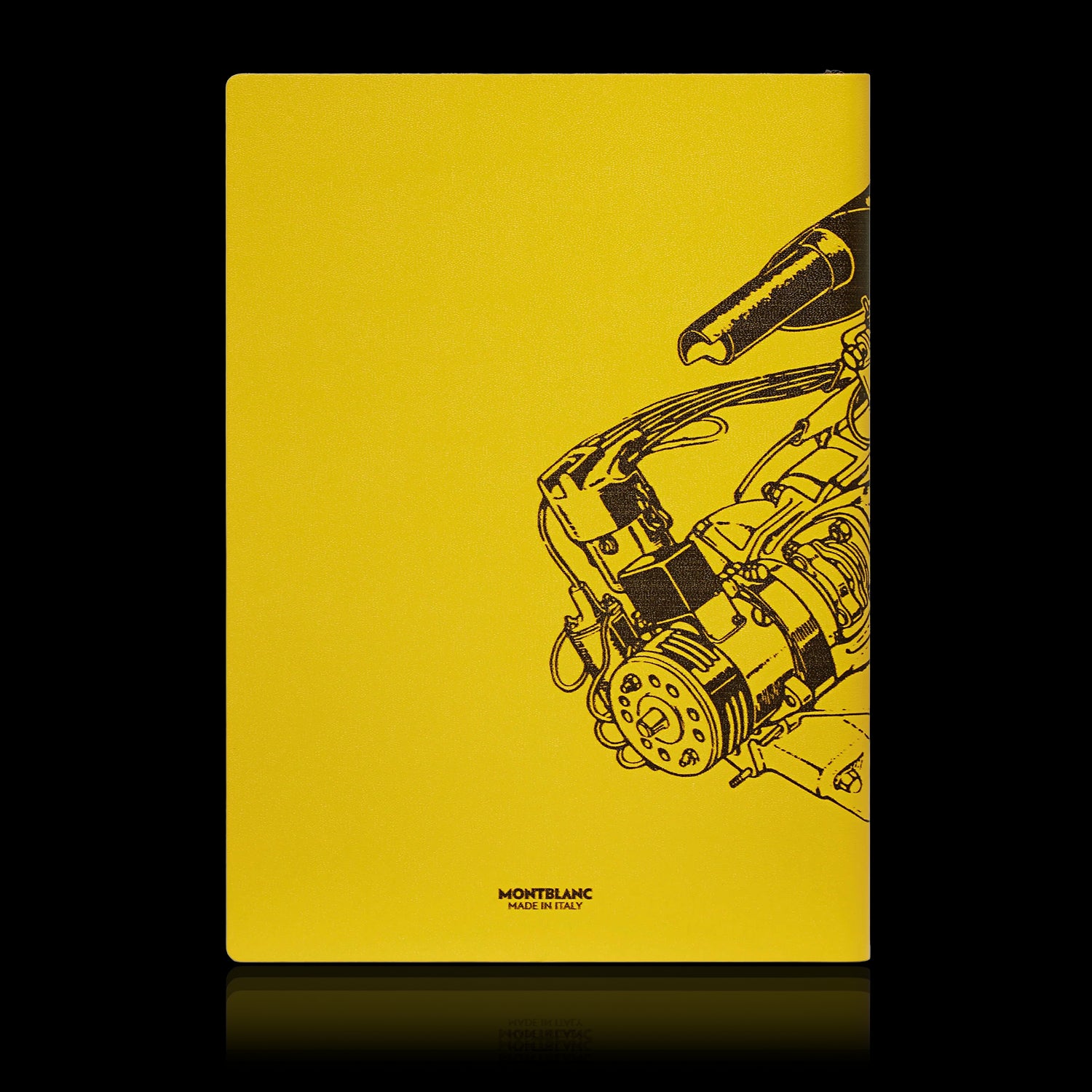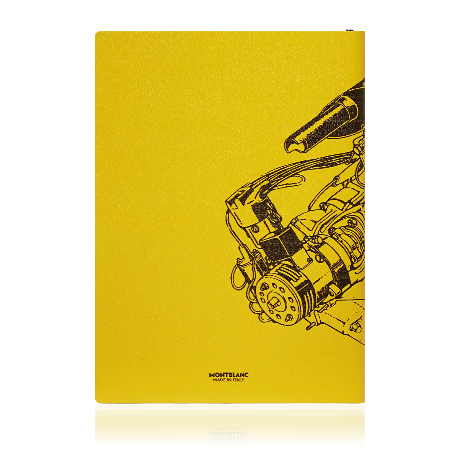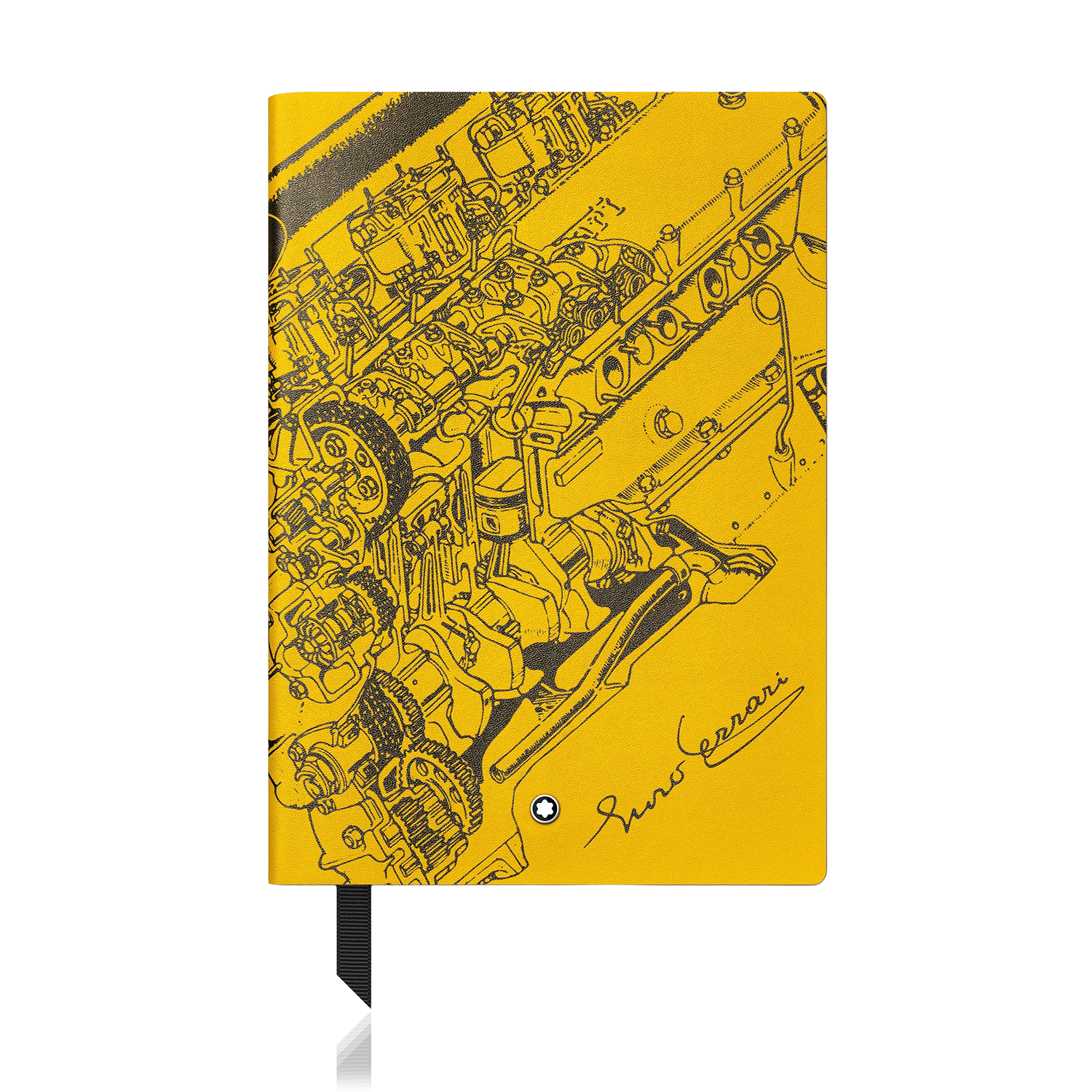 This notebook stands out with its Italian leather cover in Modena Yellow, an emblematic shade reminiscent of the famous Ferrari race cars. The cover features a digital print representing a detailed drawing of an internal combustion engine, accompanied by Enzo Ferrari's signature, adding a personal and historical touch to its design.