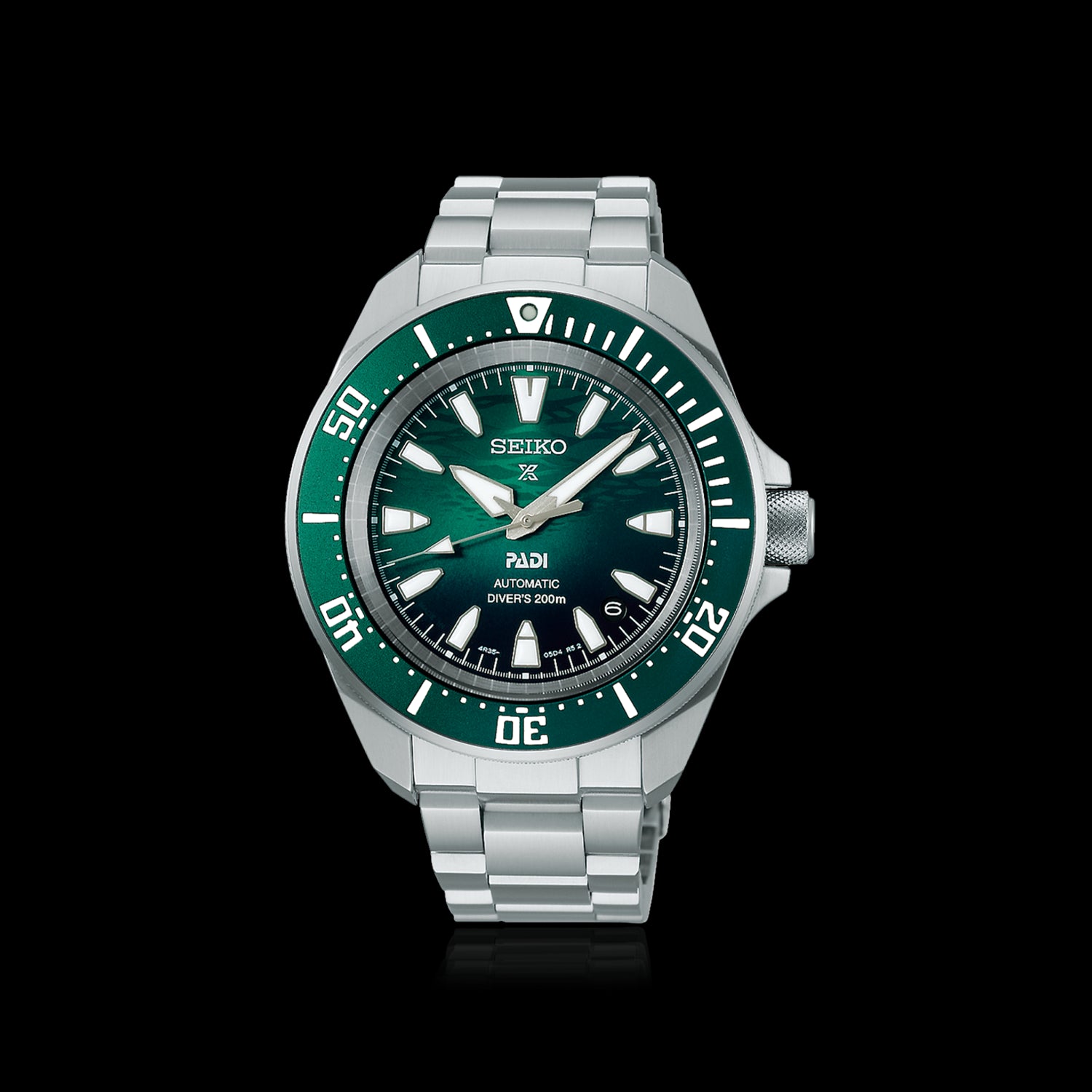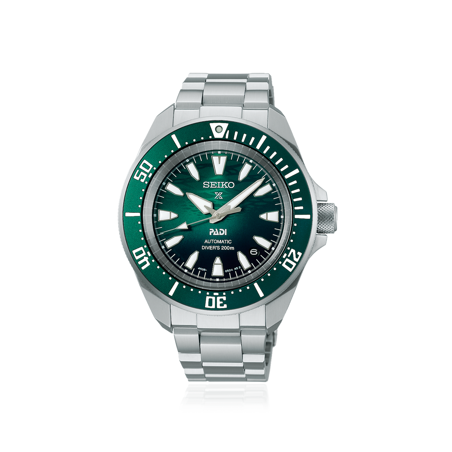 An emerald-green gradation dial inspired by the shimmering light and rippling surface as seen from underwater.