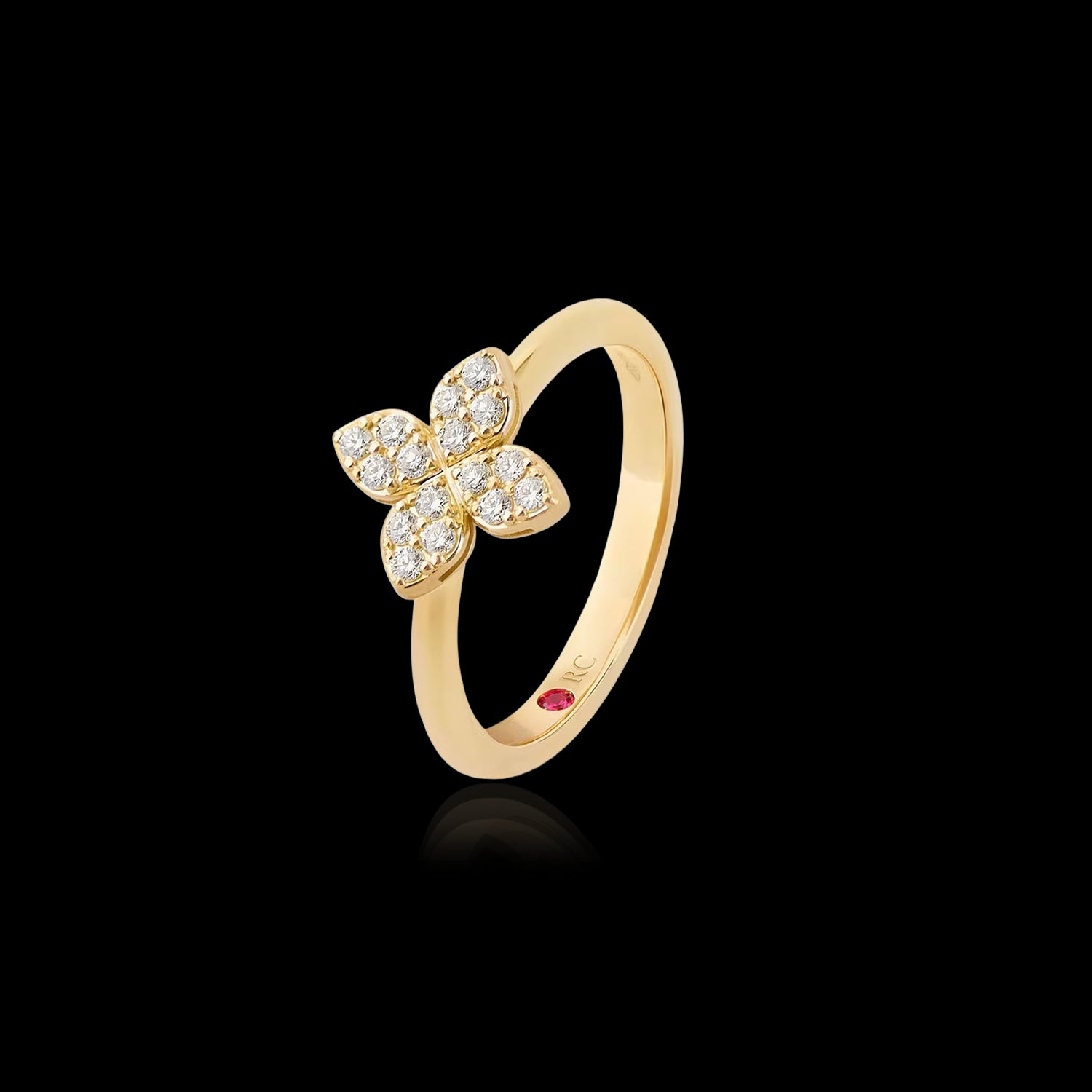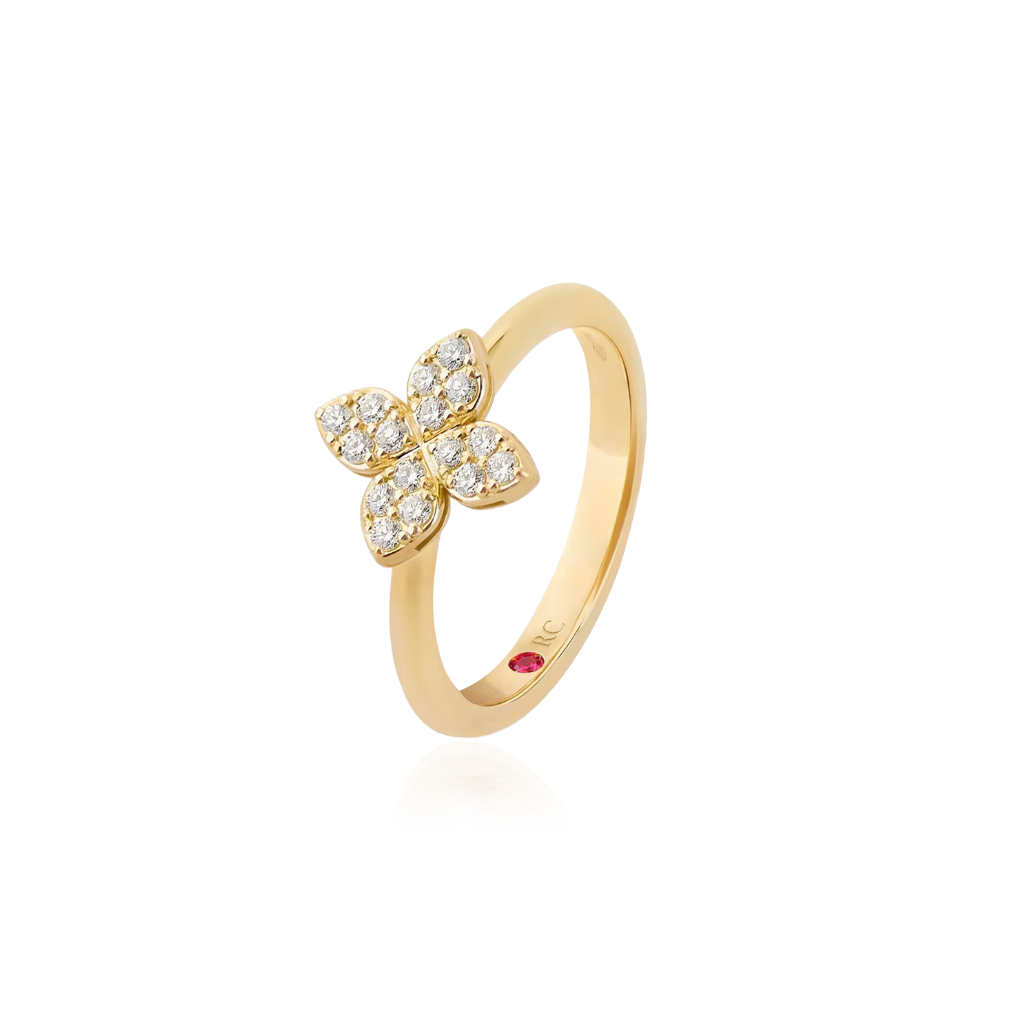 Diamonds illuminate this cute floral ring by Roberto Coin, featuring 18Kt yellow gold and the magnificence of a handmade jewel.