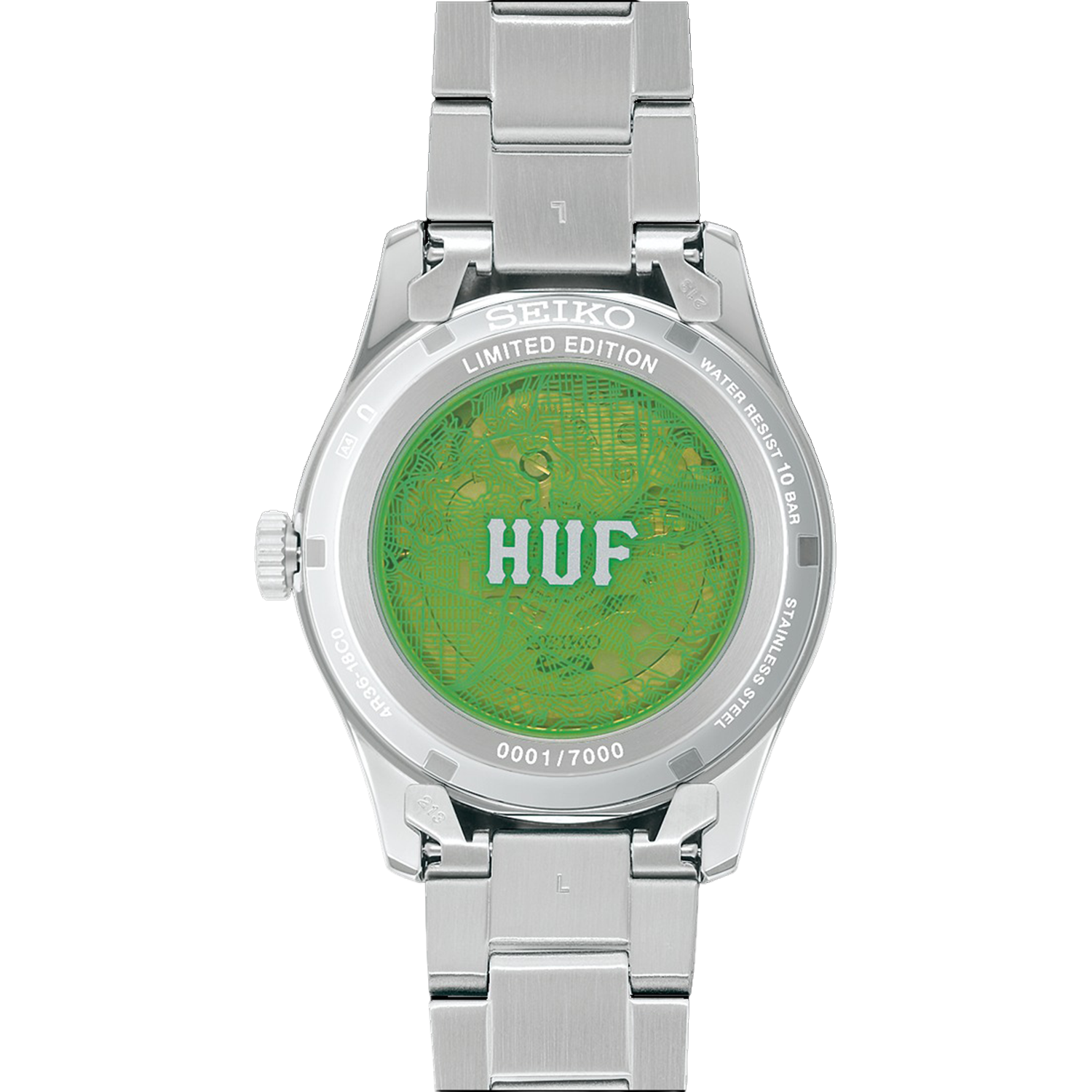 The exhibition case back features the same “HUF Green” as the dial and is decorated with a graphic inspired by San Francisco, the city where HUF was founded.
