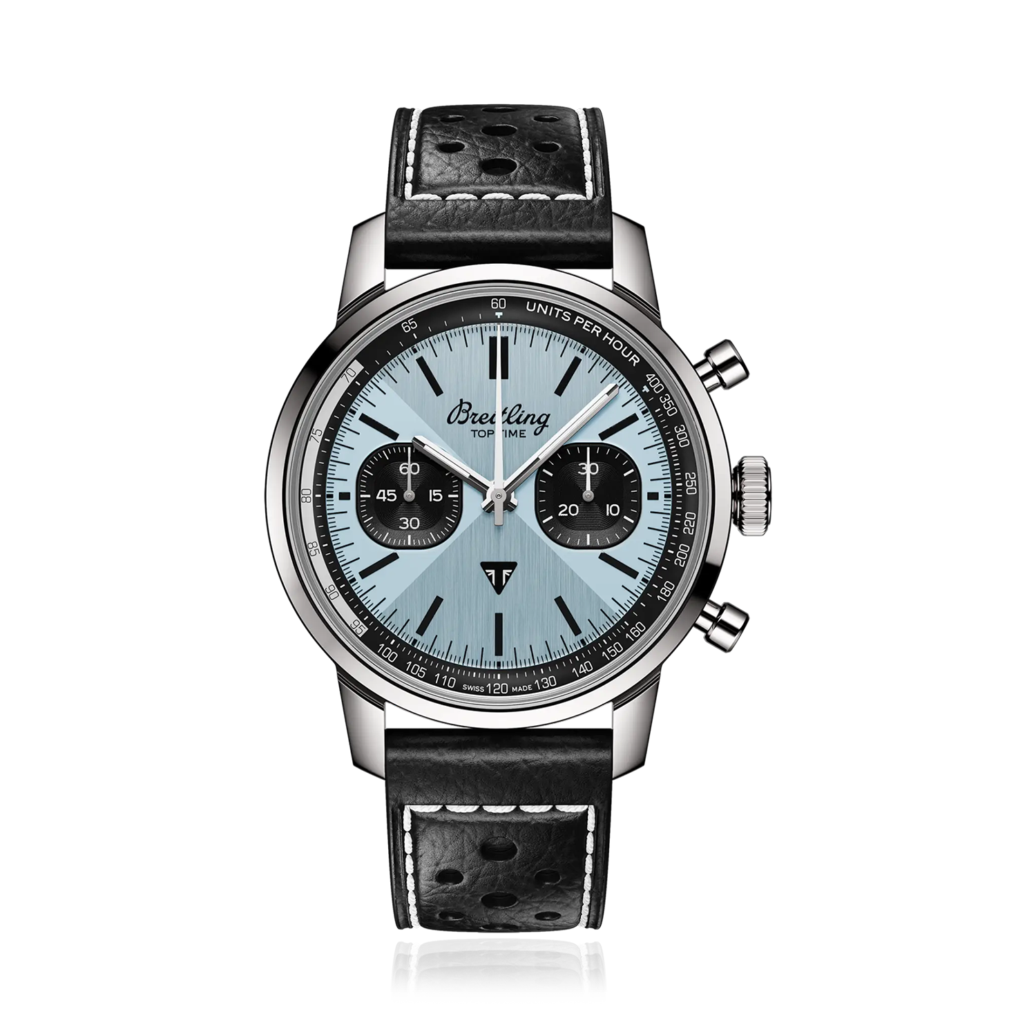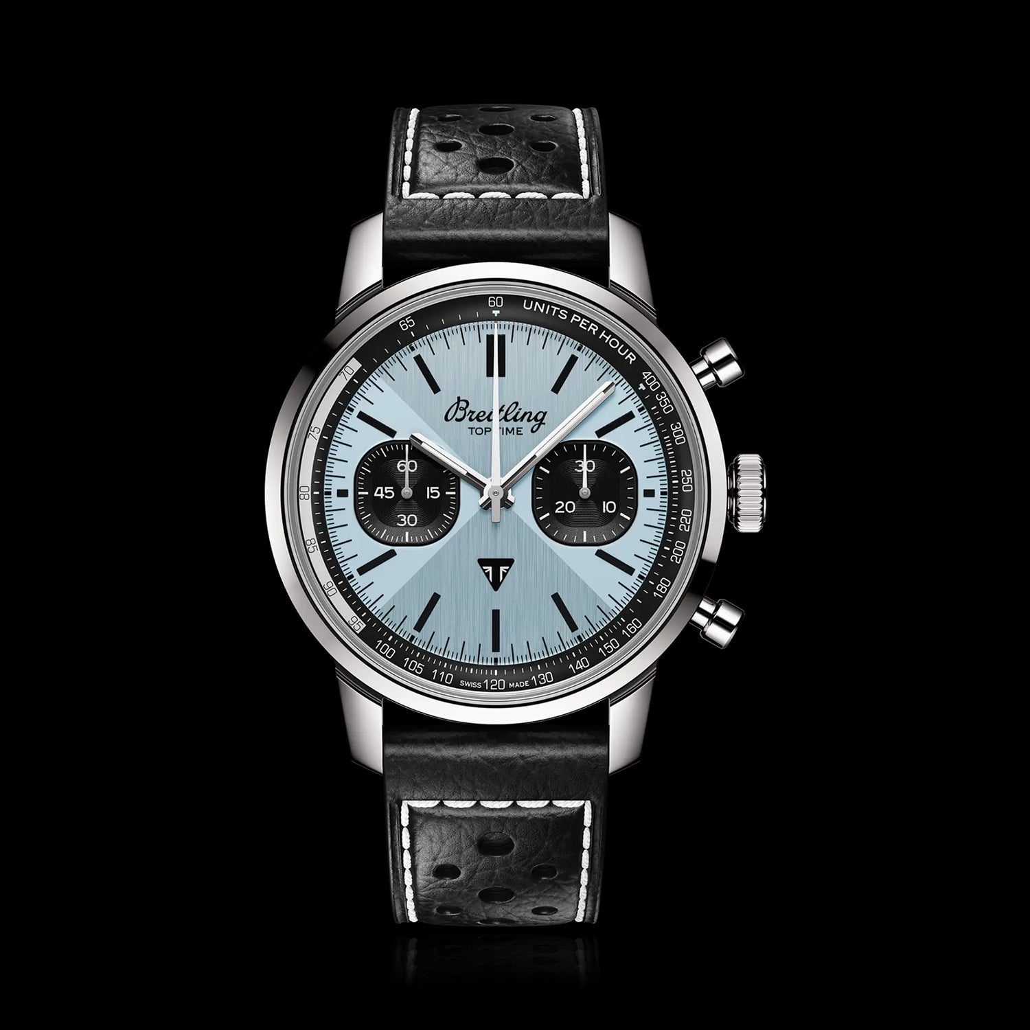 The 1960s was a decade of experimentation, fun, freedom and energy. Whether cruising on a motorcycle or revving up a sportscar, living life at full speed was the order of the day. Willy Breitling felt this change of pace and set out to design an unconventional chronograph that would capture the verve of era. He called it the Top Time. That spirited tradition continues today with Breitling partnering with some of the coolest names in wheels to create its Top Time designs. A collaboration with British heritage motorcycle brand Triumph, this watch’s highlight is its ice-blue dial. The distinctive shade was precisely color matched to a Triumph Thunderbird 6T from 1951, and a rare, blue-dialed Breitling Top Time Ref. 815 from the 1970s. Collectors are sure to pick up on a few other throwbacks to vintage Breitling that include a retro logo, mushroom chronograph pushers and a “Zorro” dial design. The bowtie motif introduced on Top Time in the 1960s (and nicknamed for the wily swashbuckler’s mask) has been subtly integrated using a metal brushing technique that creates a radiant play of light and texture. The design features a Triumph emblem at 6 o’clock, a speed-measuring tachymeter scale and contrasting “squircle” (not quite square, not quite round) subdials that give the feel of a vintage dashboard gauge. It also comes with a brag-worthy engine under the hood: the exceptional Breitling Manufacture Caliber 01.